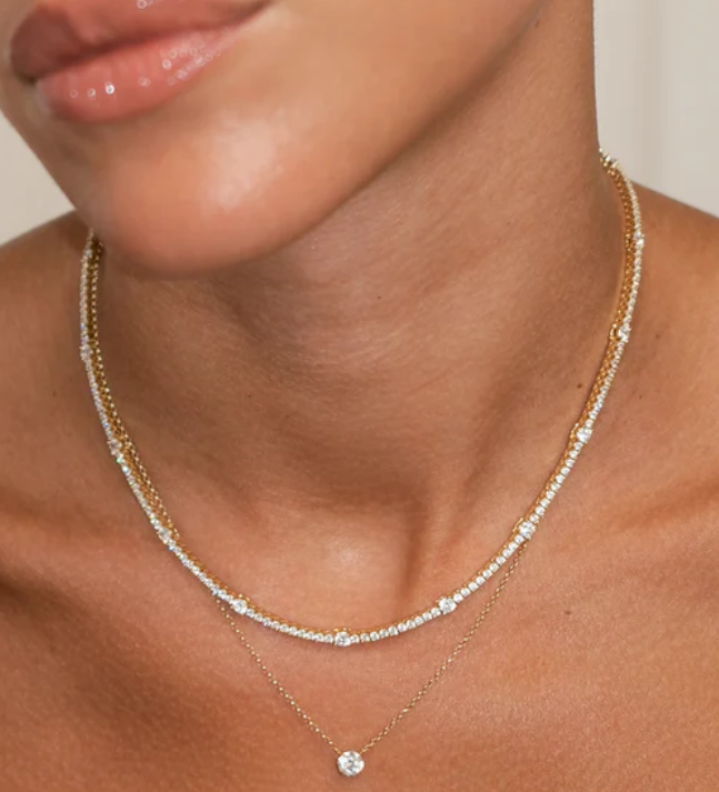 The Phoebe necklace is an effortlessly refined take on the classic tennis style, featuring beautifully cut, brilliant stones punctuated with larger round keystones.