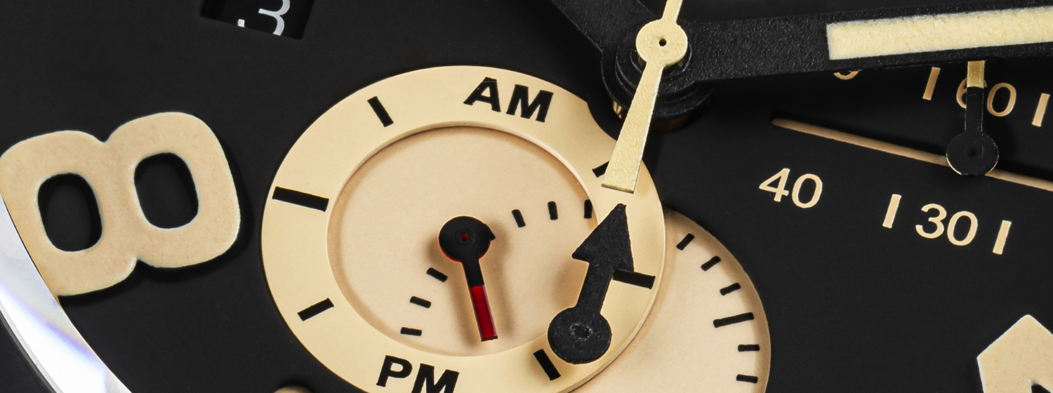 three-level black metal. Indexes and numerals treated with beige superluminova. Metal hands painted with beige superluminova treatment. 24-hour hand in red.