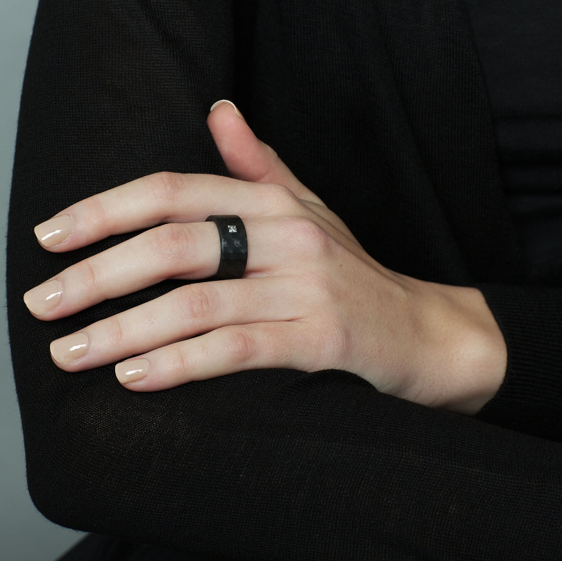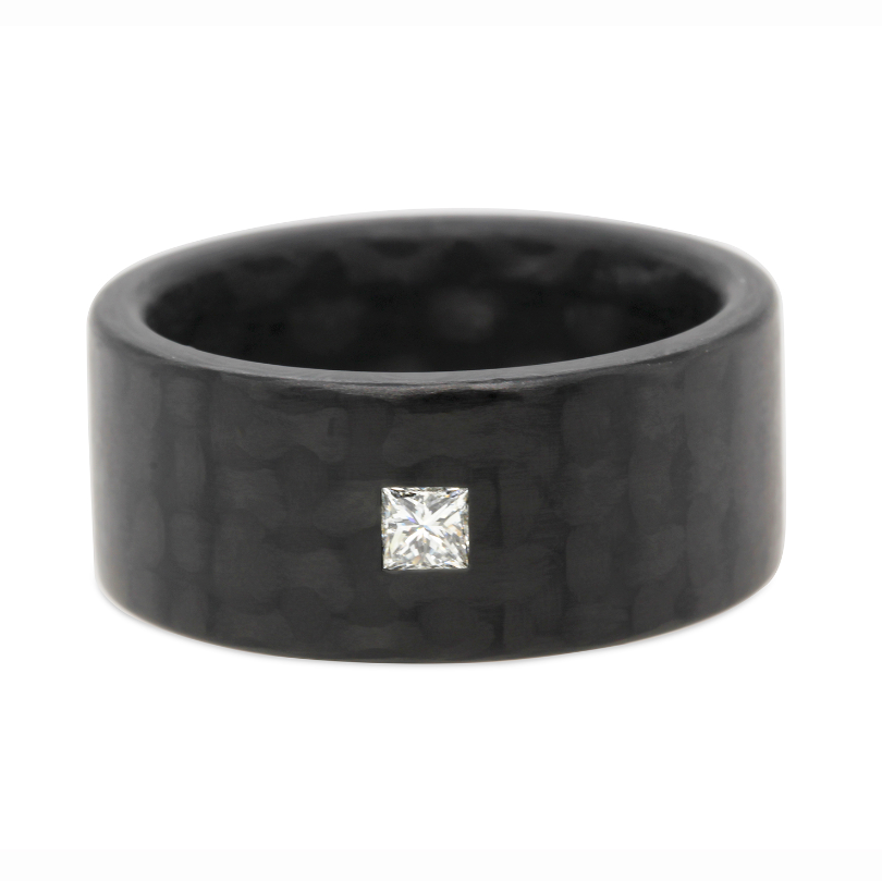 The princess diamond ring is a beautiful example of Danish low key aesthetic. Anne Cohen’s unique concept of making rings in all carbon comes to life in this piece where a specially cut princess diamond (0.17ct TW VVS1) is set flush in carbon fiber. A great choice for everyday which reflects the wearer’s individuality and sense of style.