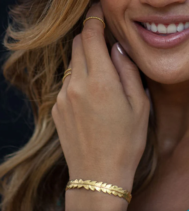 Model wears The Gold Fern Leaf Cuff