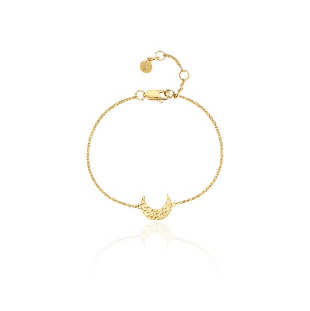 This delicate bracelet features a gold hammered moon charm on a chain with an adjustable fastening. Made in 18ct gold plated silver. The bracelet measures 7 inches. Moon height approximately 11mm.