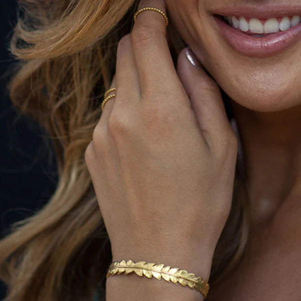 This beautiful cuff features delicate fern leaves that wrap around your wrist. Made from 18ct gold vermeil it it looks great worn on it's own or stacked with other bracelets for a more dramatic effect. Available in two sizes