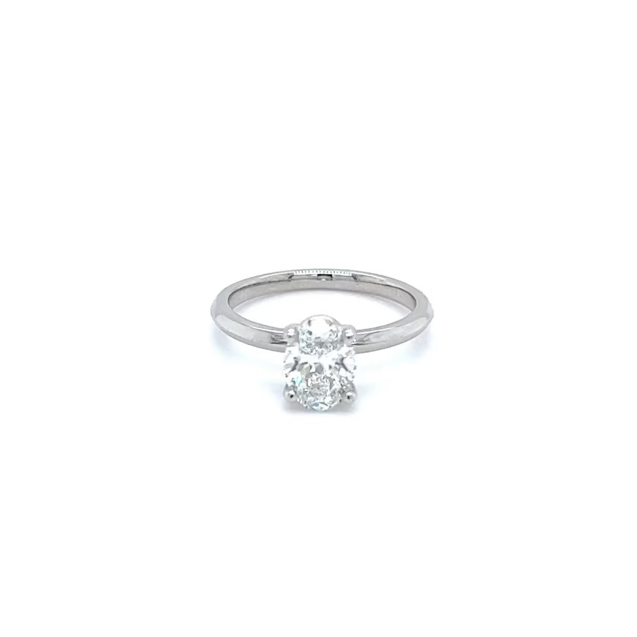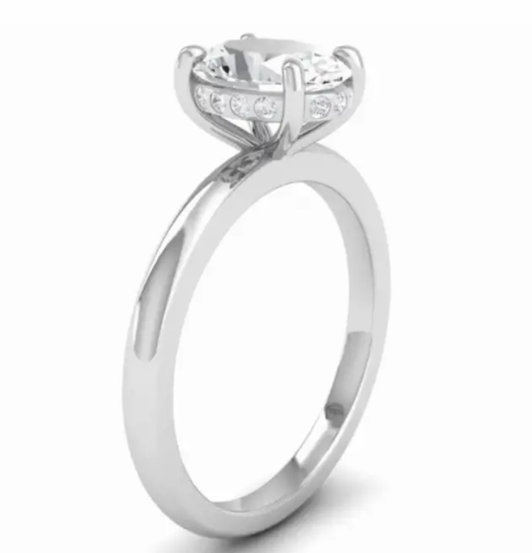 A subtle oval brilliant cut diamond Platinum engagement ring with a clever diamond hidden halo under the main stone giving it even more brilliance and fire coming directly from underneath, within a 4 claw platinum setting. for maximum brilliance.