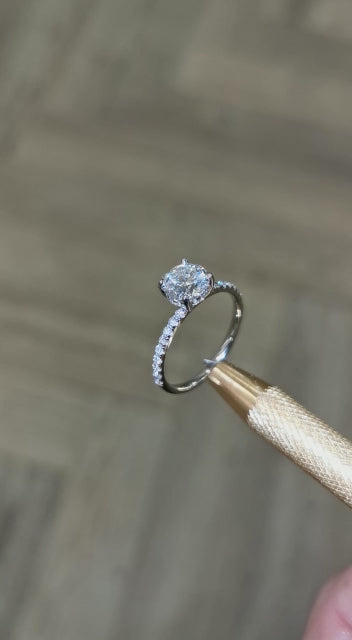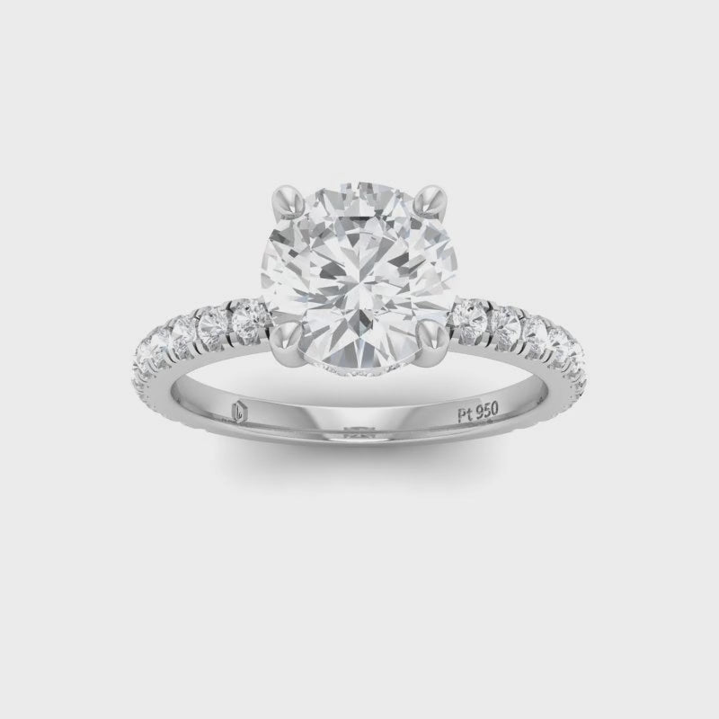 A Platinum lab grown brilliant cut diamond with hidden halo and diamond shoulders